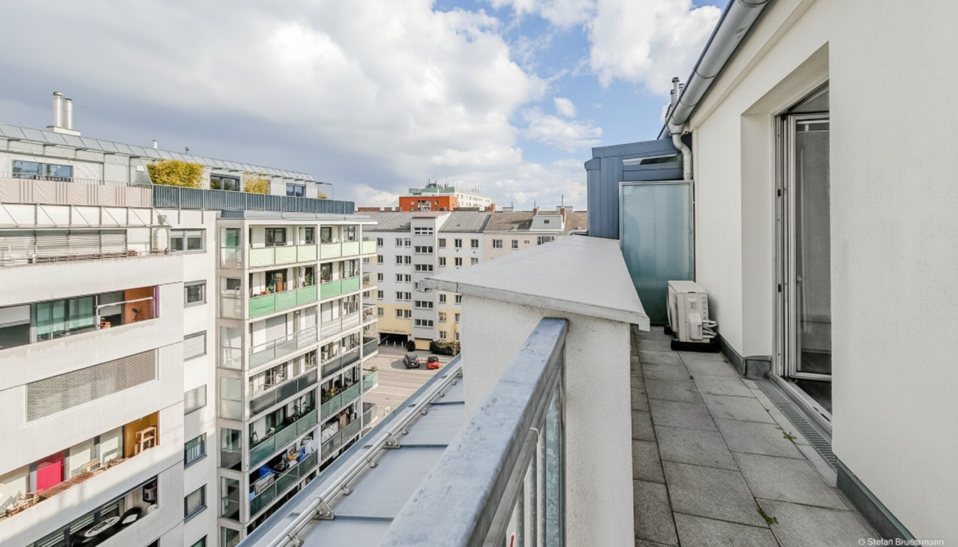Die Wohnung bietet modernes City-Living auf ca. 48m2 inklusive Terrasse und befindet sich im 6. Liftstock. Das helle Wohnzimmer mit Klimaanlage und Zugang zur Terrasse (ca. 7m2) ist Nord-Ost -gerichtet. Das Schlafzimmer, das Bad und die Küche sind Süd-West in den ruhigen Innenhof gerichtet.