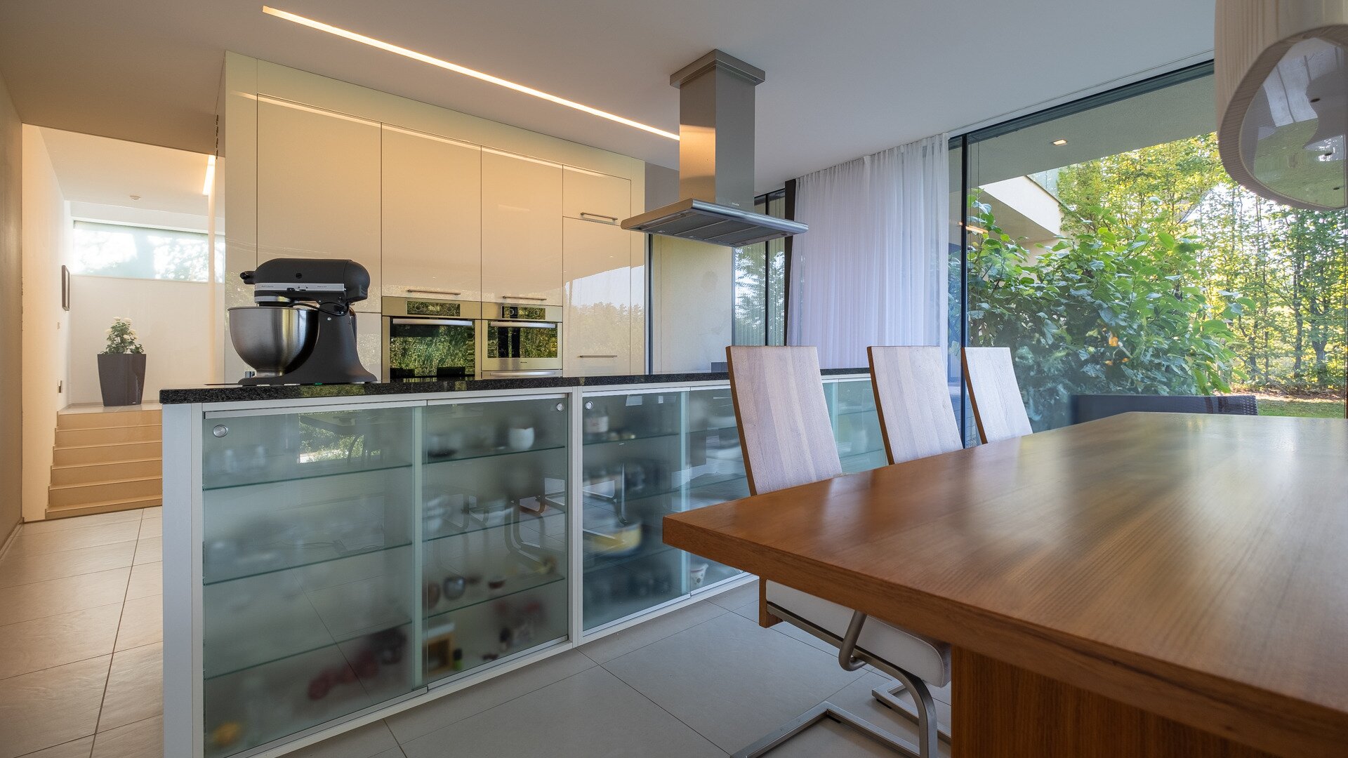 Eine weitere eindrucksvolle vollausgestatteter Luxus Küche und dazu eine Back-up- und Cafeküche mit schönem Essbereich machen die Treffen mit Familie und Freunden zum würdevollen Erlebnis.Vor allem finden Sie in diesem Design – Refugium Glas-, Fenster- und Türfronten vom Boden bis zur Decke, die die umliegenden Naturschönheiten mit Lichtung und Landschaft mit Architektur und Natur verbinden lassen.