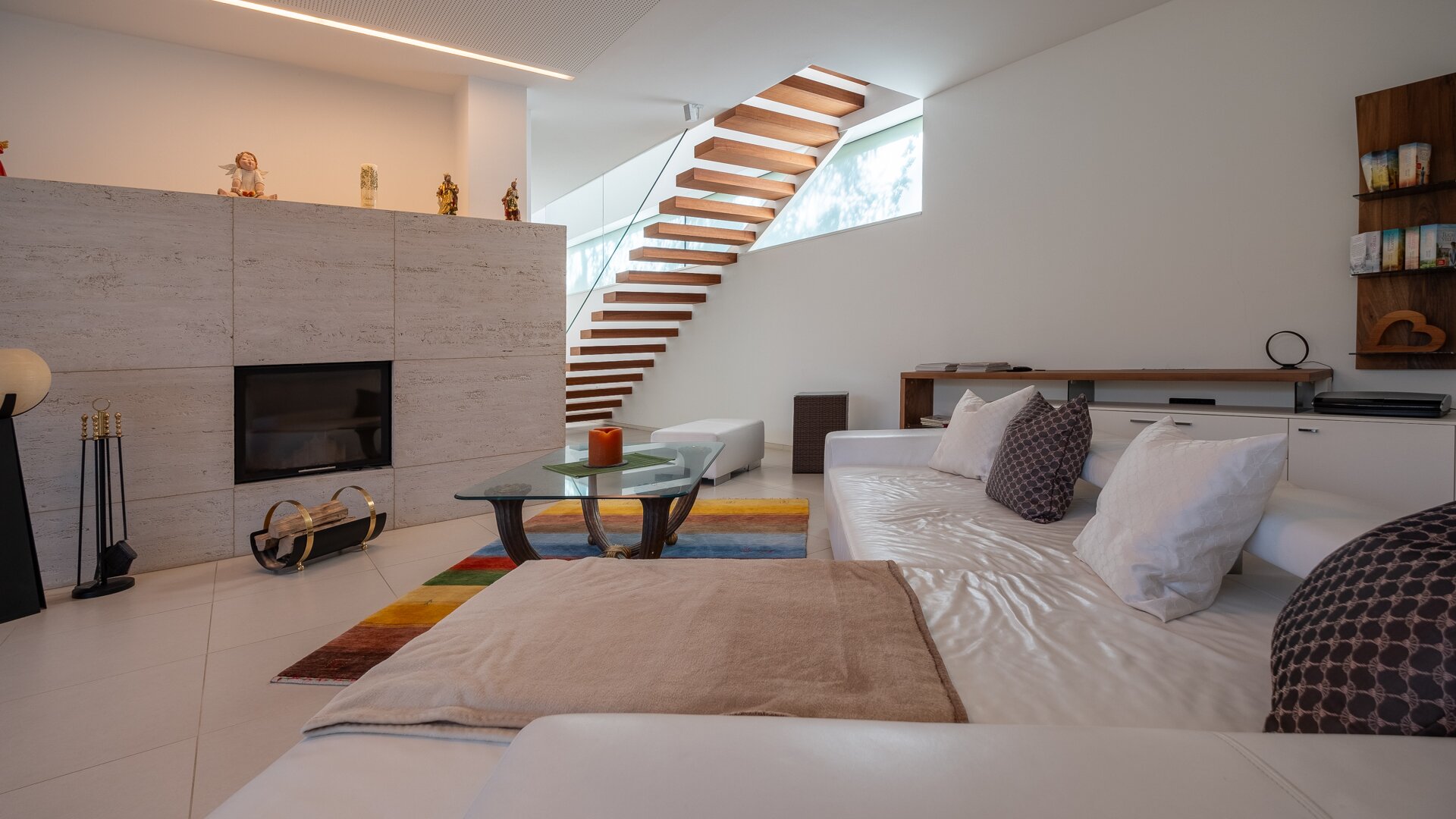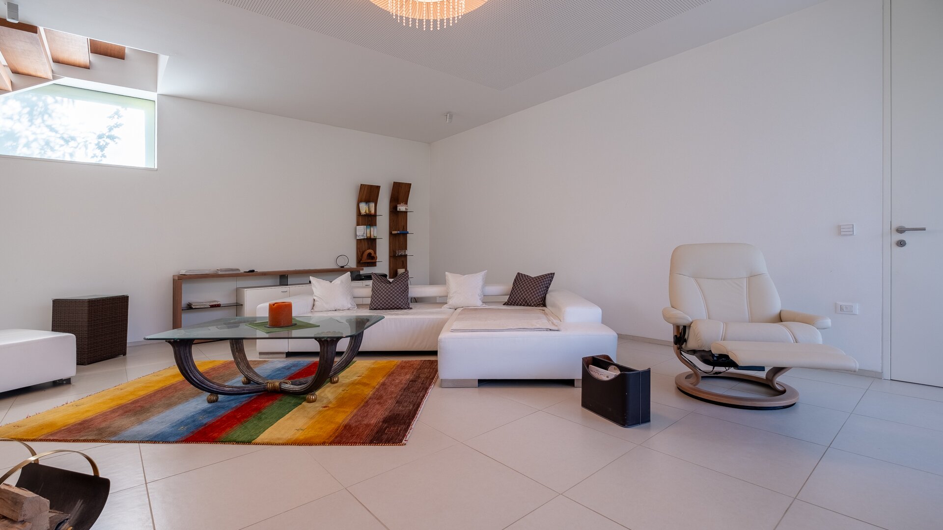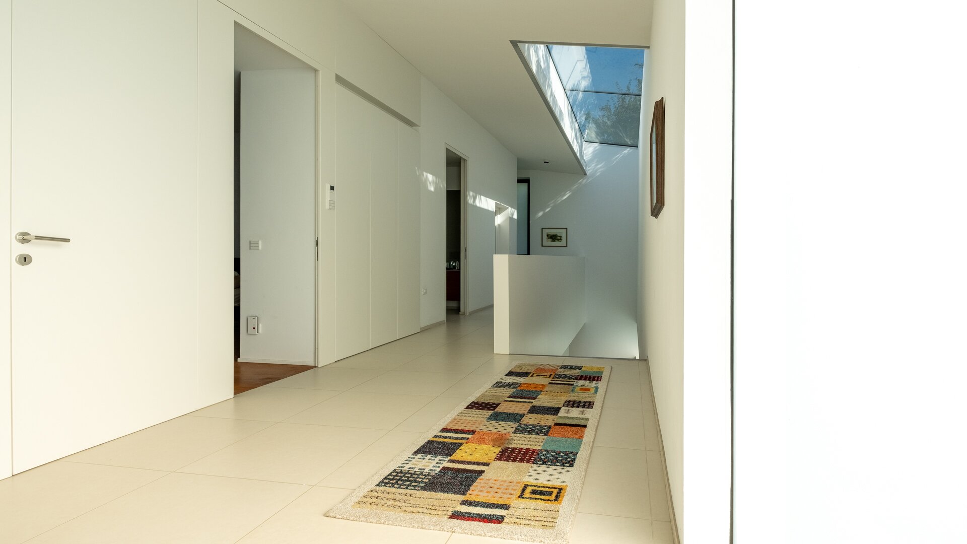 Lichtspiele durch sehr große Glasflächen, auch im Deckenbereich, vor allem auch für den Entree-,Gang- und Stiegenbereich gepaart mit wohltuenden Farben und Materialen.
