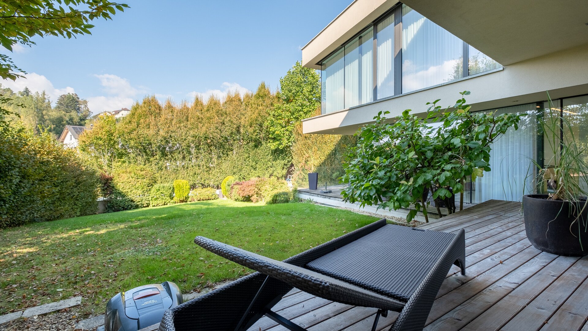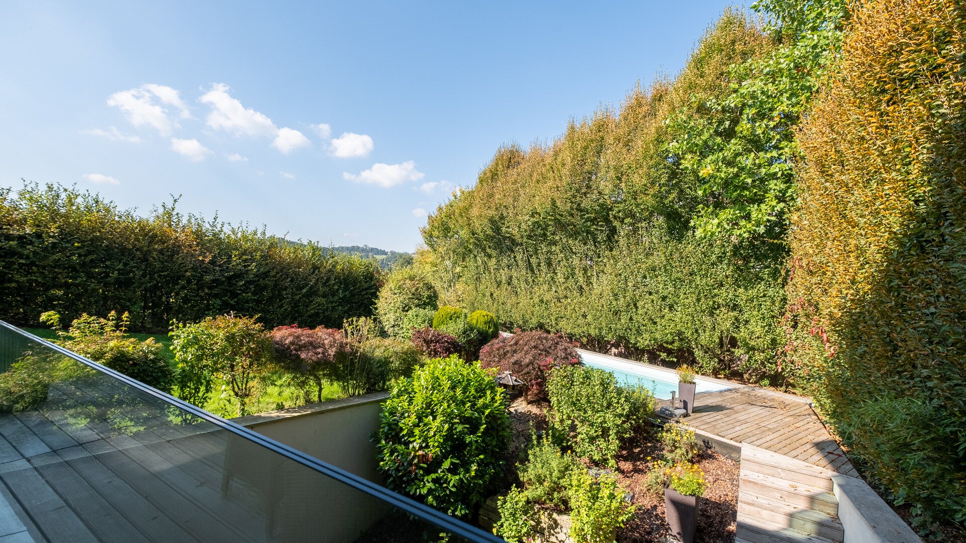 Ein eigener uneinsehbarer Ruhe – Hof verbindet den sehr gepflegten Garten mit dem großzügigen echten Schwimm – Badbereich und der Immobilie.