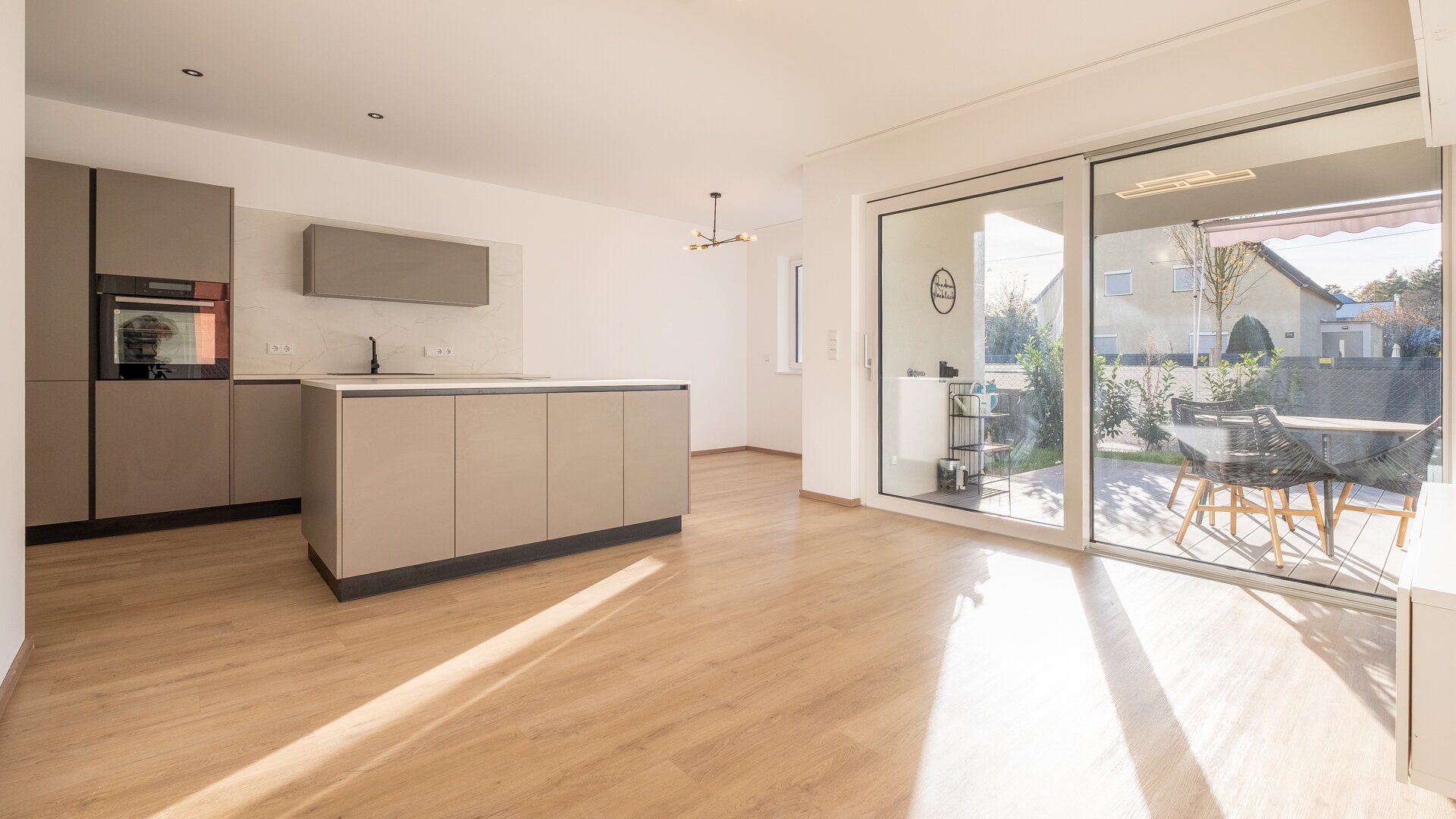 Das Herzstück der Wohnung ist das helle Wohn-Esszimmer mit großer Fensterfront und direktem Zugang zum Garten. Hier befindet sich eine hochwertige Einbauküche mit integrierter Kücheninsel – voll ausgestattet mit sämtlichen Geräten und optimal auf moderne Wohnbedürfnisse ausgelegt. Der Wohn-Essbereich bietet genügend Raum für gemeinsames Kochen, Essen und Entspannen.