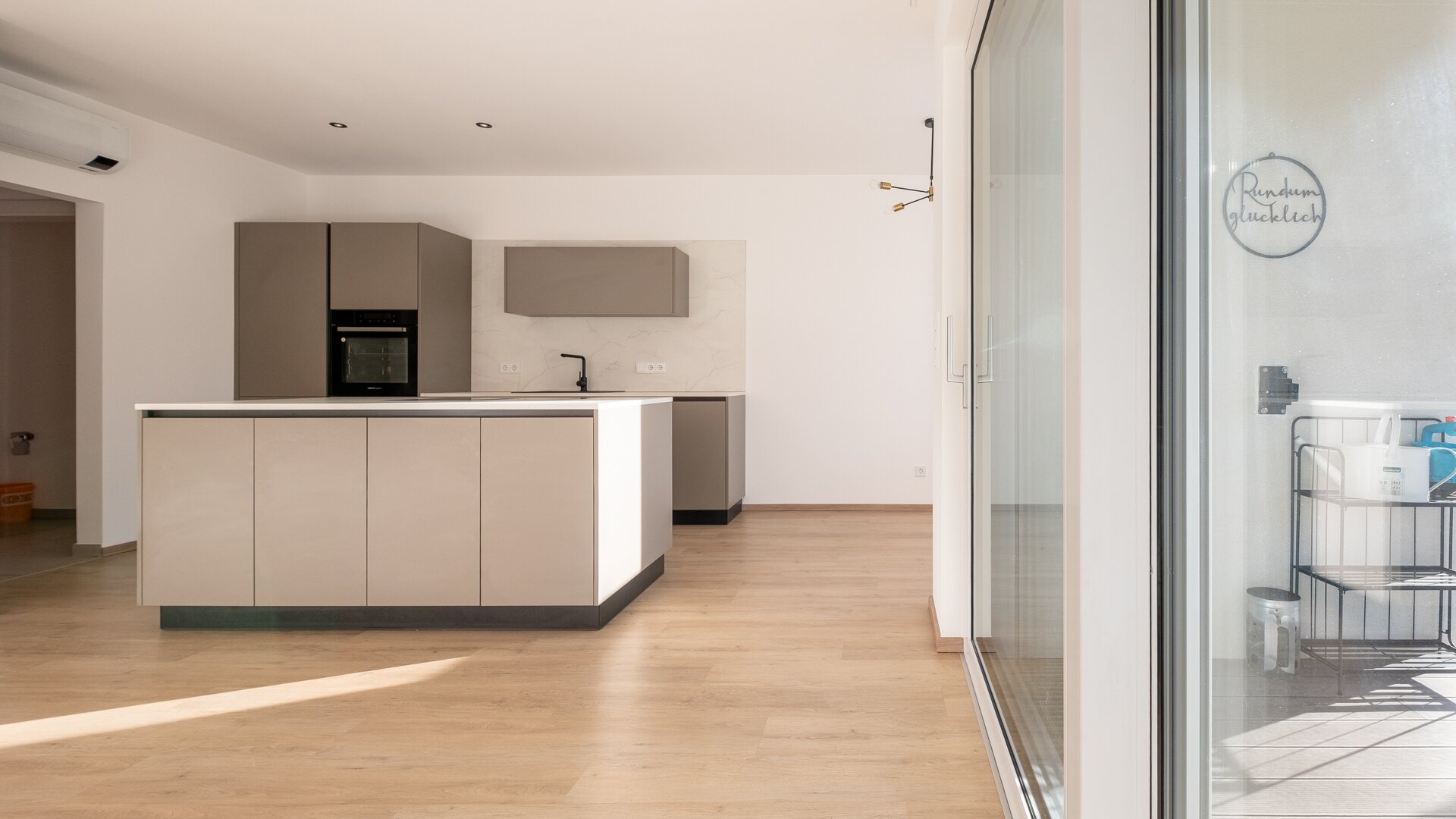Das Herzstück der Wohnung ist das helle Wohn-Esszimmer mit großer Fensterfront und direktem Zugang zum Garten. Hier befindet sich eine hochwertige Einbauküche mit integrierter Kücheninsel – voll ausgestattet mit sämtlichen Geräten und optimal auf moderne Wohnbedürfnisse ausgelegt. Der Wohn-Essbereich bietet genügend Raum für gemeinsames Kochen, Essen und Entspannen.