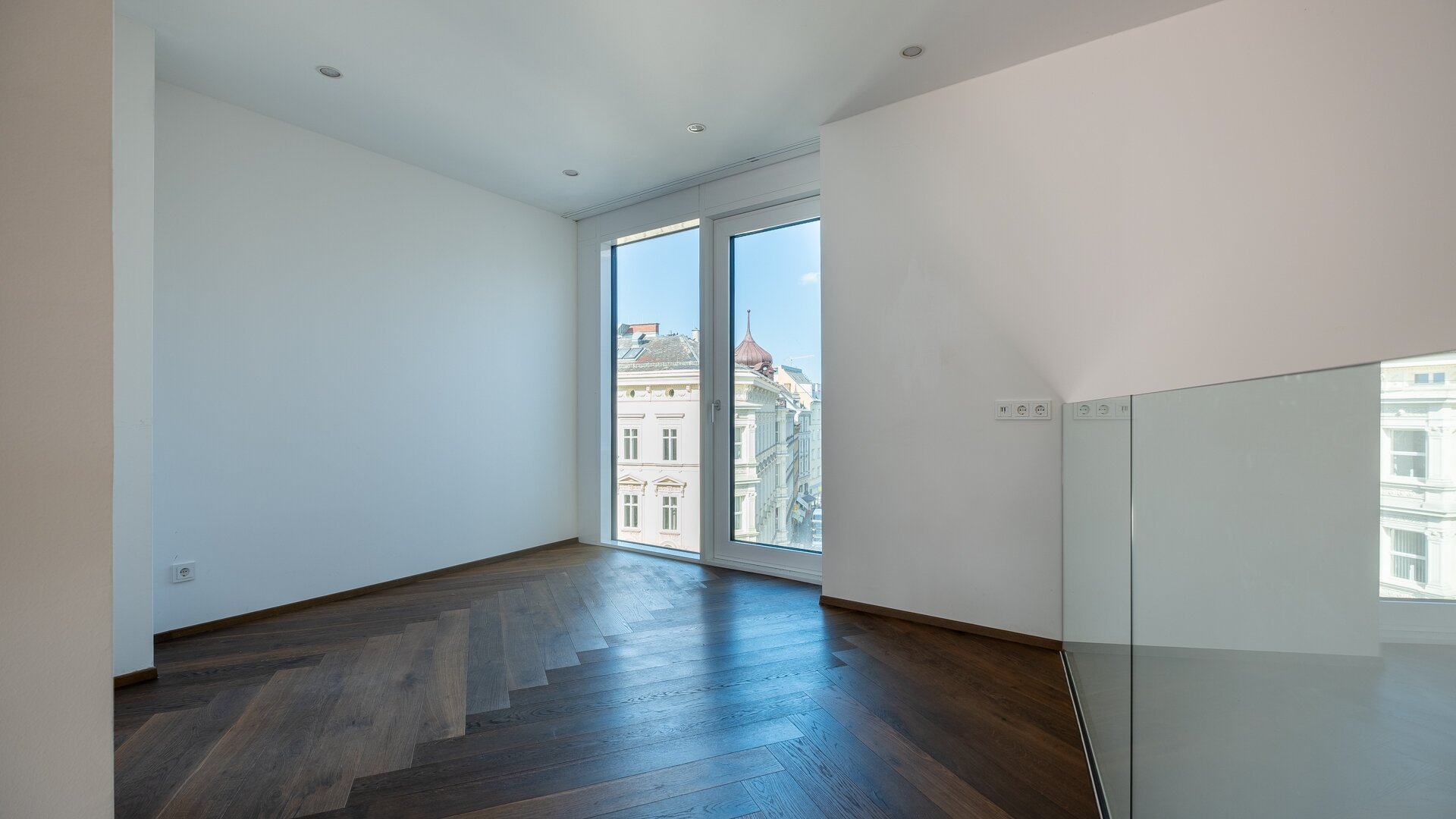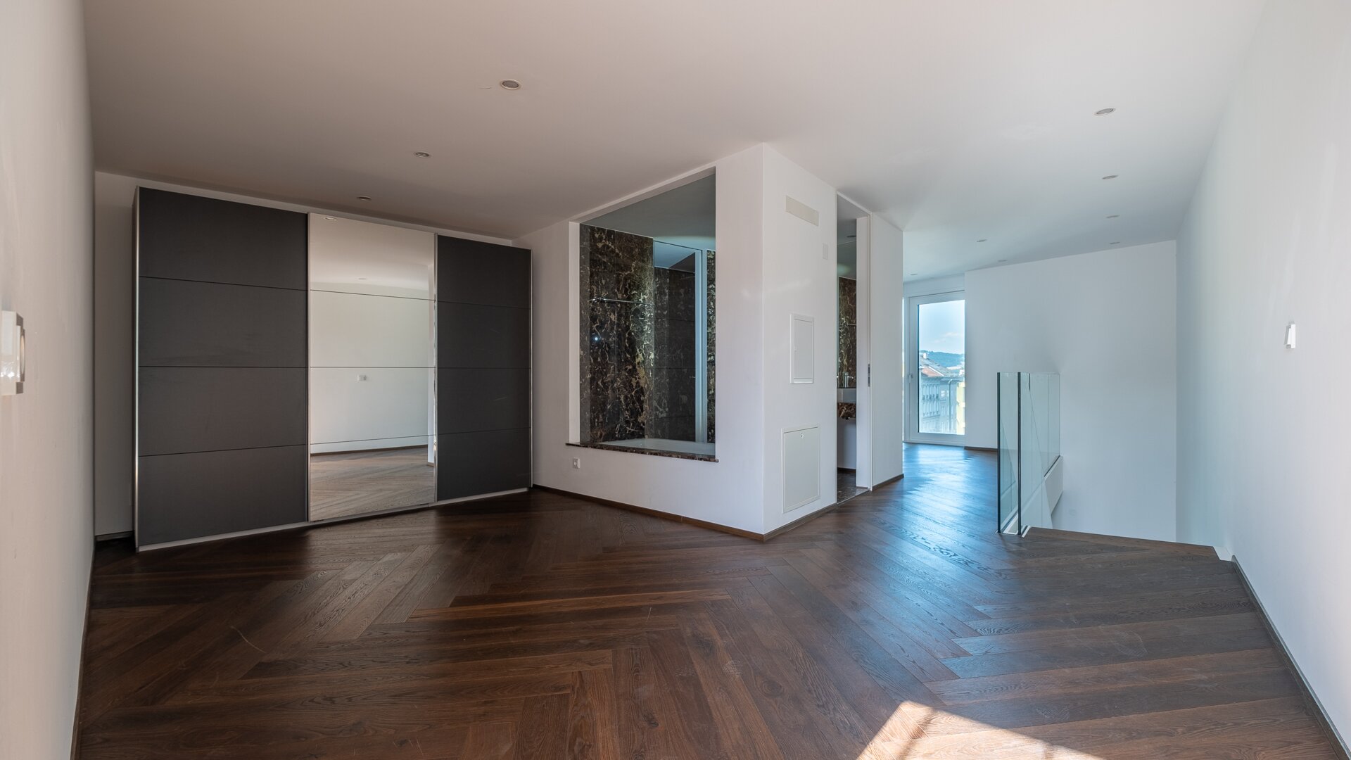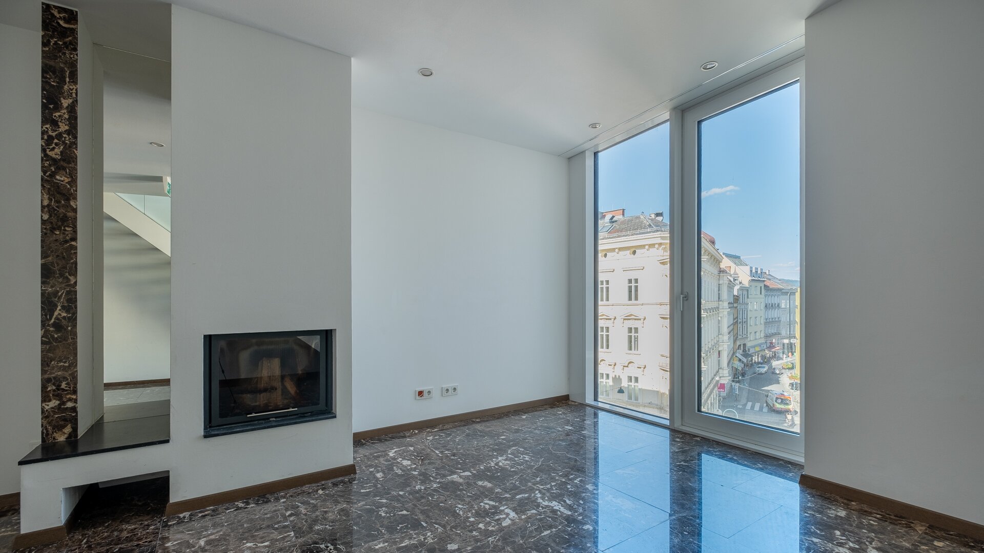 Die Ausstattung mit raumhohen Türen, Echtholzböden und Naturstein verleiht der Immobilie durchgehend ein hochwertiges, urbanes Flair.