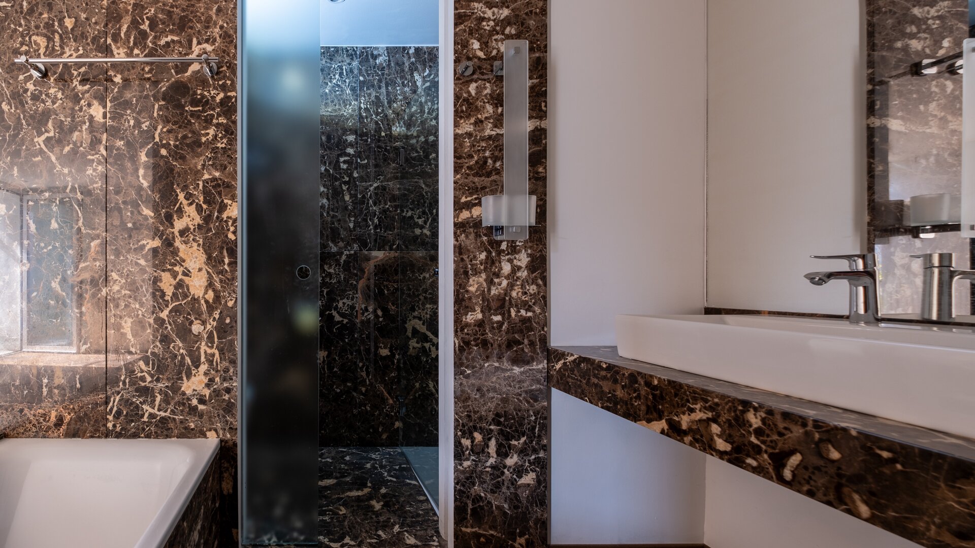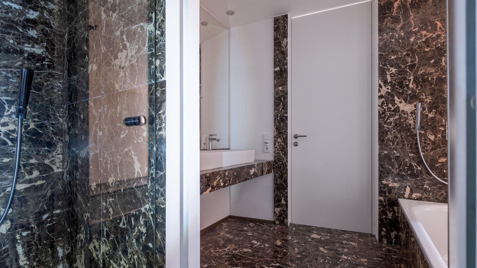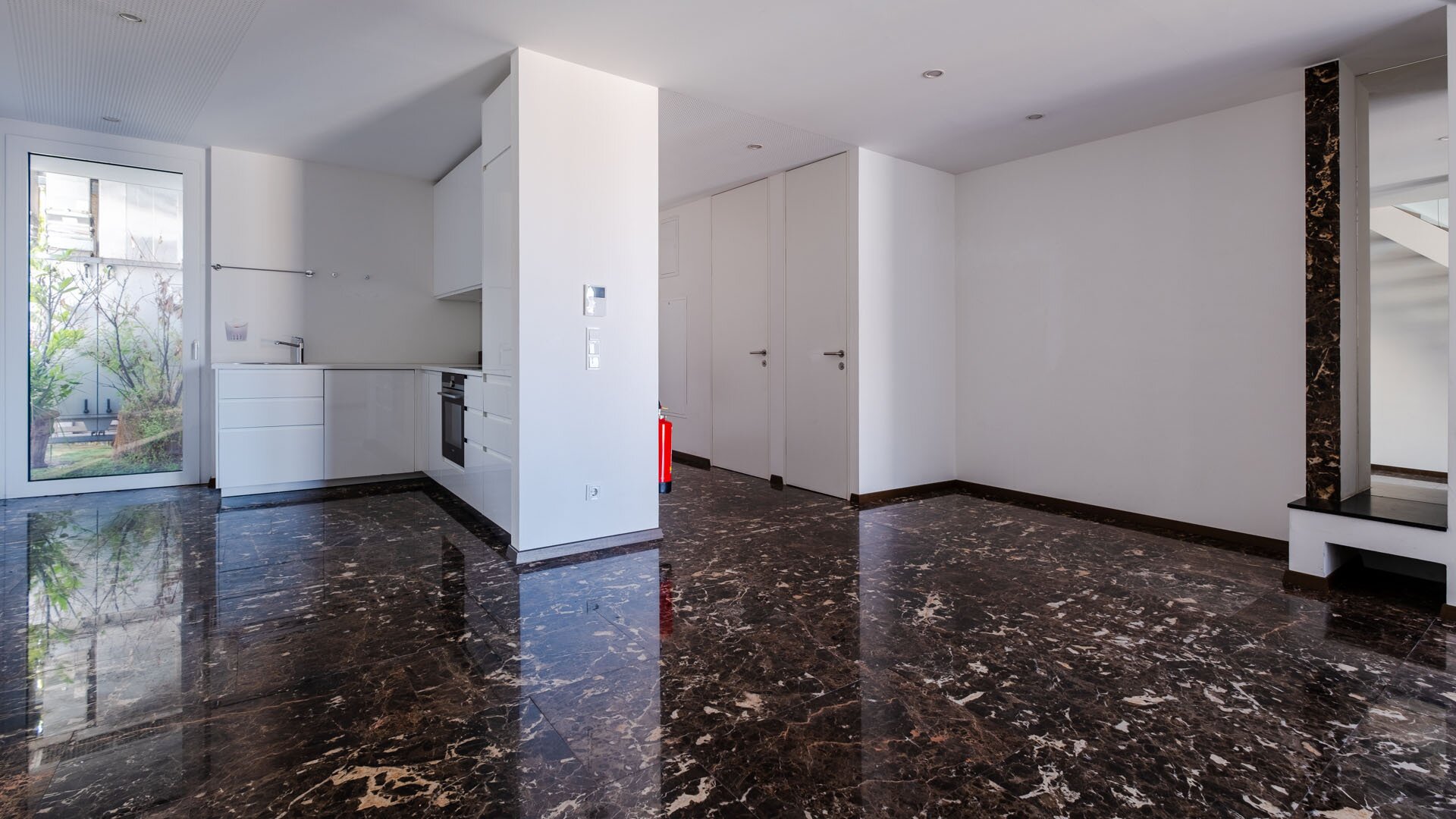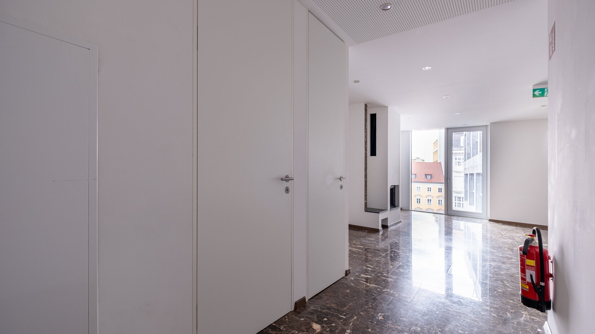 Die Ausstattung mit raumhohen Türen, Echtholzböden und Naturstein verleiht der Immobilie durchgehend ein hochwertiges, urbanes Flair.
