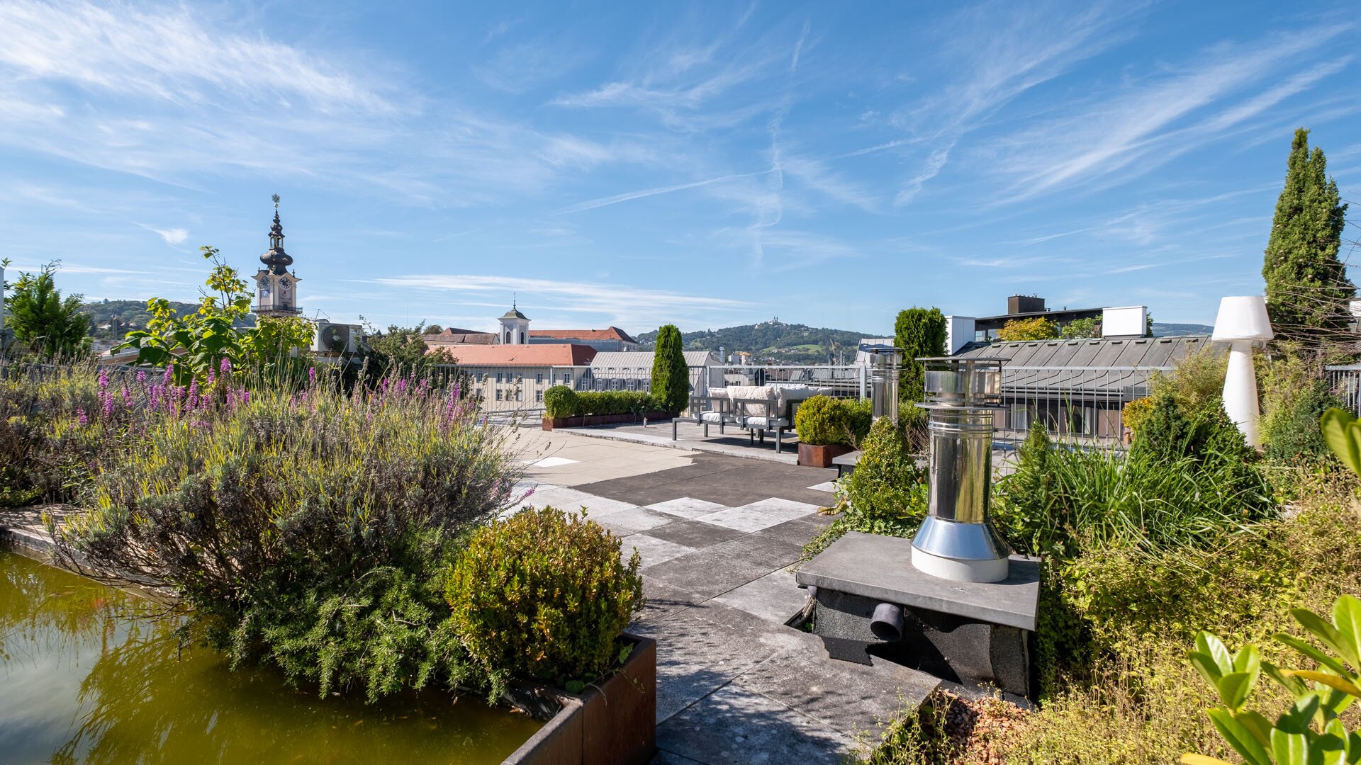 Zusätzlichen Raum zur Entspannung oder für repräsentative Anlässe bietet die großzügige Dachterrasse mit Loungebereich, Sonneninsel und einem kleinen Teich mit Goldfischen.