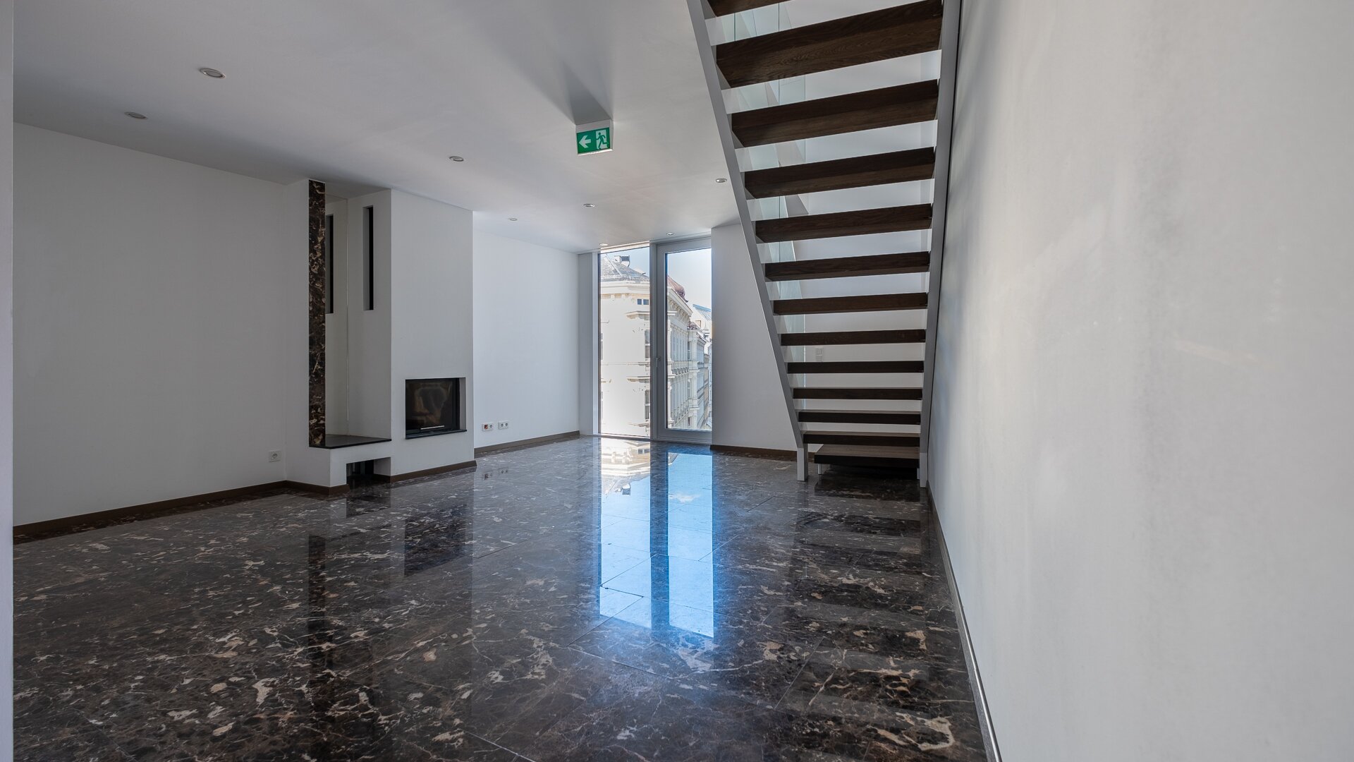 Die Ausstattung mit raumhohen Türen, Echtholzböden und Naturstein verleiht der Immobilie durchgehend ein hochwertiges, urbanes Flair.