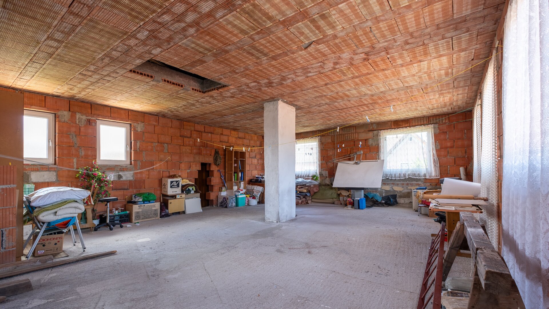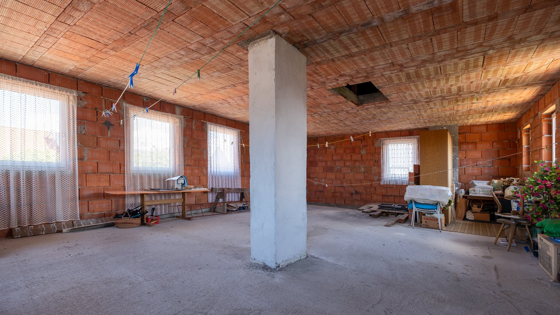 Über den Straßenseitigen Hauseingang gelangt man direkt in den noch unfertigen Vorzimmerbereich des Gebäudes. Von hier aus wäre es möglich die Stiege nach oben fertigzustellen. Im Obergeschoß sind ca. 60 m² Rohausbau für eine zweite Wohneinheit möglich.