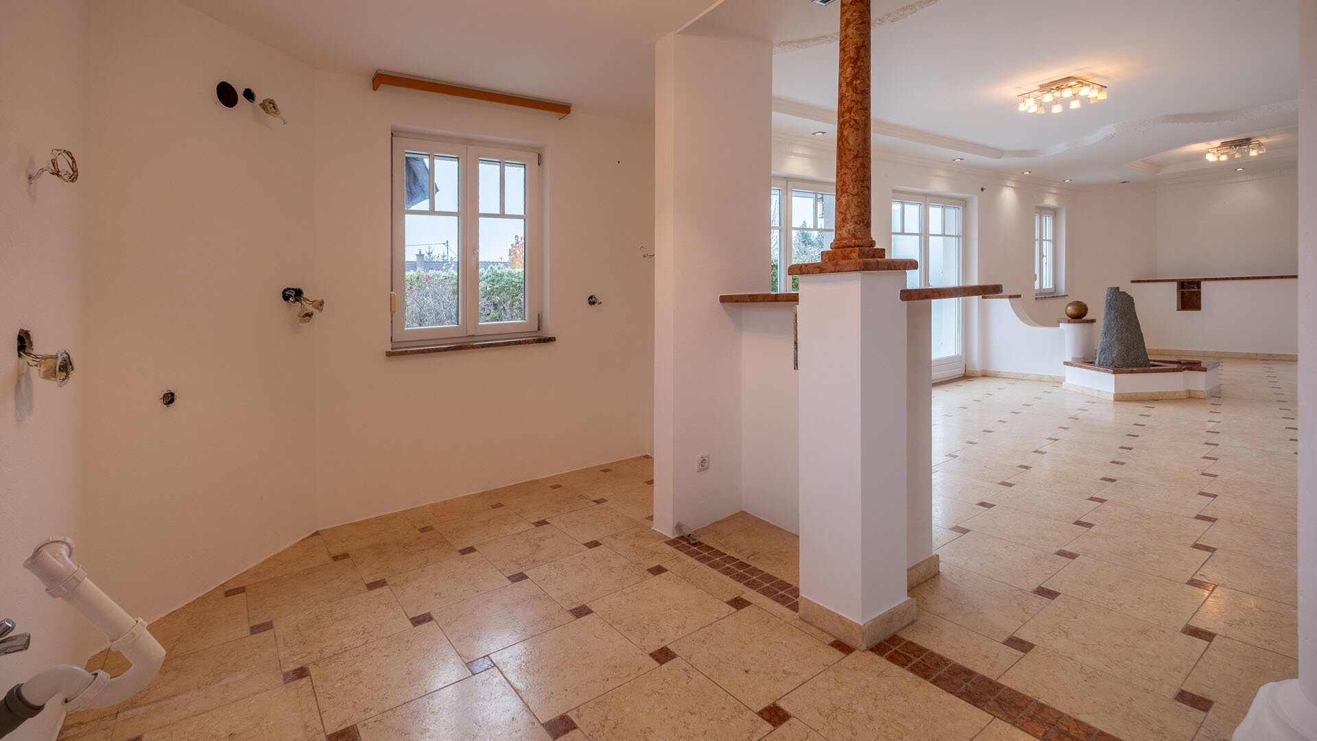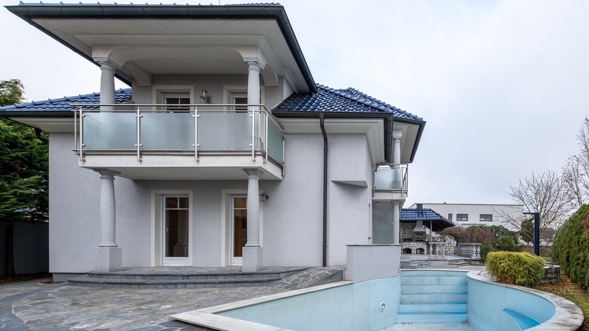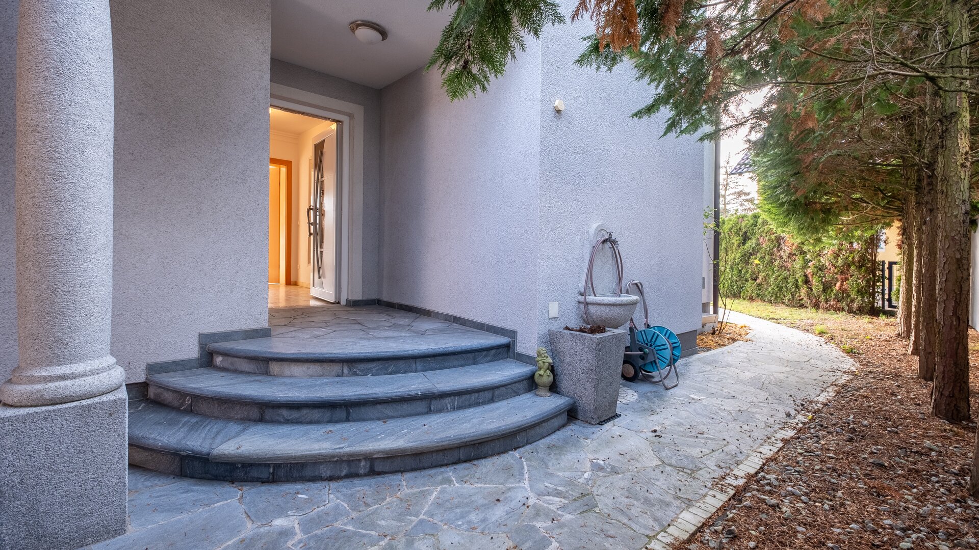 Die hochwertige Ausstattung, wie die stilvolle Steinmaterialen, schaffen eine elegante Atmosphäre, während die Fußbodenheizung für wohlige Wärme sorgt. Der Kamin im Wohnzimmer bietet an kalten Winterabenden eine gemütliche Atmosphäre und lädt zum Verweilen ein. Die moderne Zentralheizung garantiert zudem eine angenehme Temperatur zu jeder Jahreszeit.