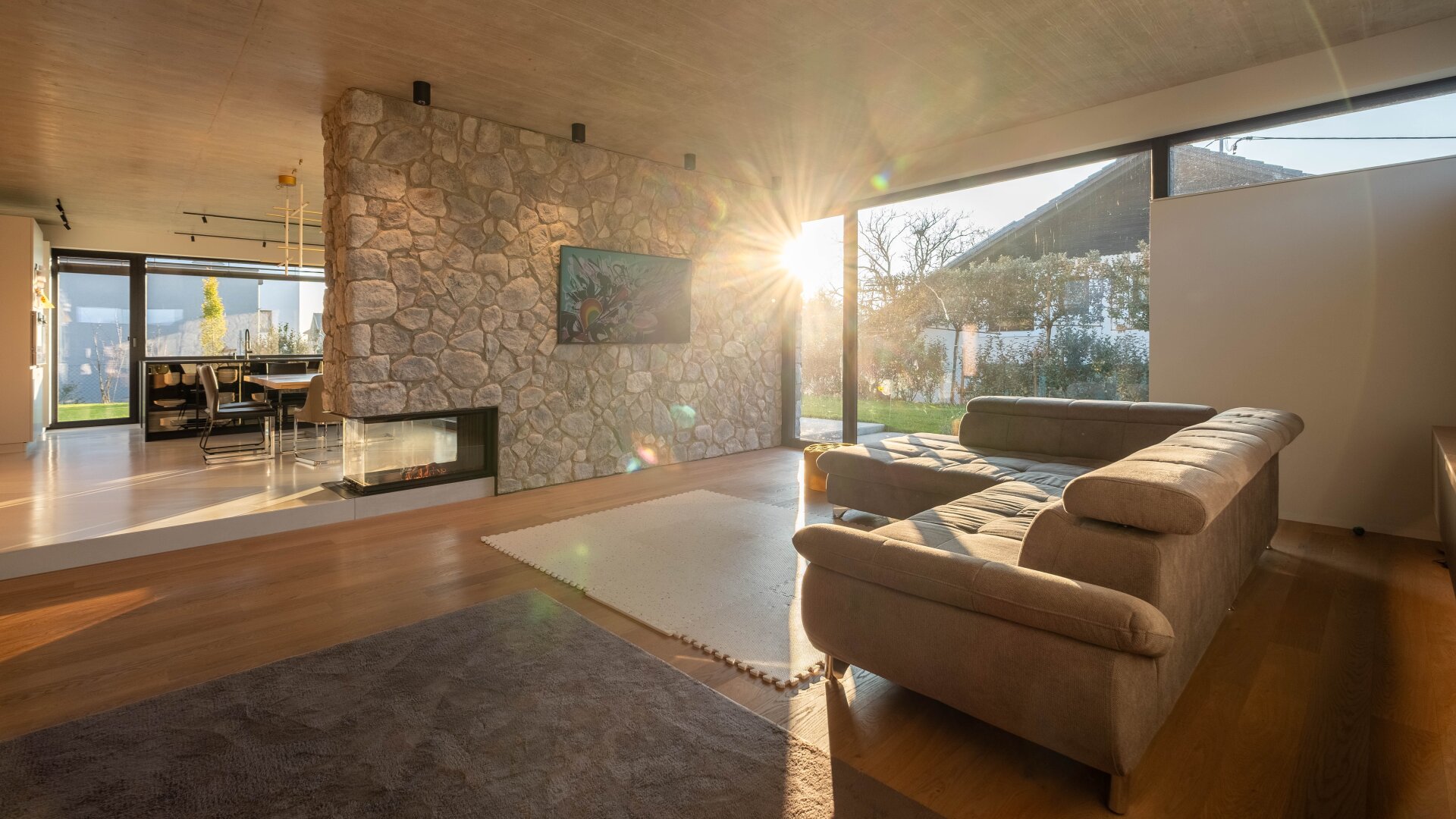 Im Inneren erwartet Sie ein Wohnraumkonzept, das Design, Komfort und Funktionalität perfekt vereint. Großzügige Raumhöhen und sonnendurchflutete Bereiche schaffen ein offenes, leichtes Ambiente. Edle Materialien wie ein Pandomo-Fußboden, ausgewählte Dielenböden sowie flächenbündige Türen setzen stilvolle Akzente und unterstreichen den exklusiven Charakter des Hauses. Sichtbetondecken verleihen dem Innenraum eine moderne, urbane Note, während eine Natursteinwand mit integriertem Kamin für Wärme und wohnliche Eleganz sorgt.