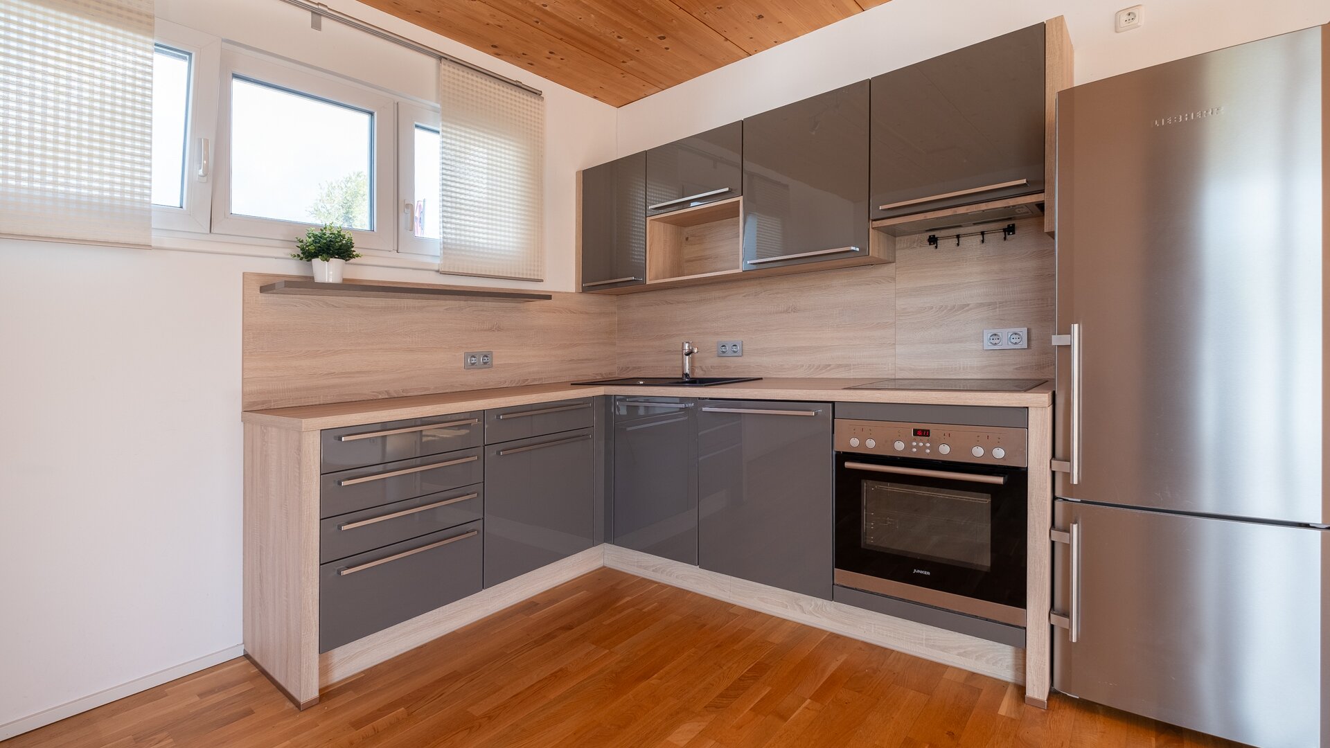 Herzstück der Wohnung ist der offene Wohn-Essbereich mit Einbauküche. Von hier aus gelangen Sie auf den Balkon, der zum Frühstücken, Entspannen oder einfach zum Genießen des Grünblicks einlädt.