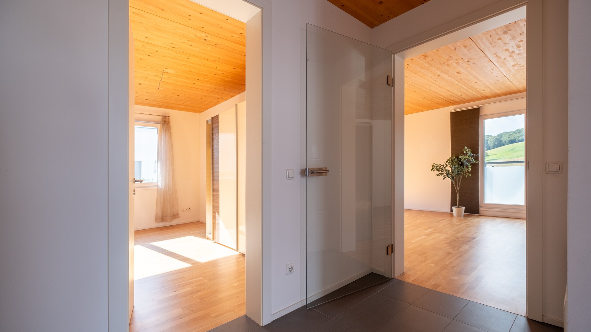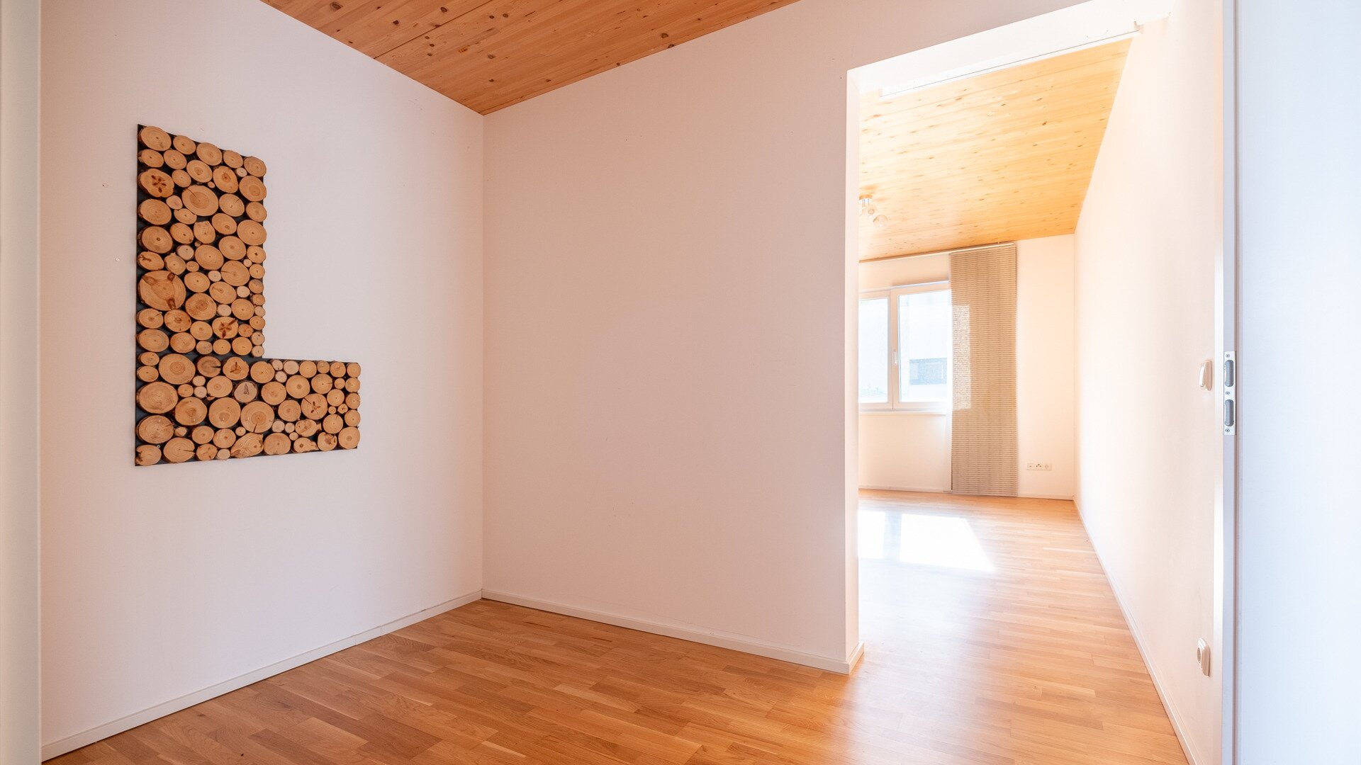 Das Schlafzimmer ist direkt mit einem praktischen Ankleideraum verbunden und bietet dadurch zusätzlichen Stauraum und Komfort. Ein weiteres Zimmer kann flexibel als Kinderzimmer, Büro oder Gästezimmer genutzt werden und passt sich so individuellen Bedürfnissen an.