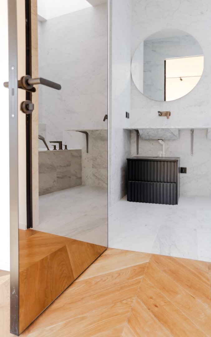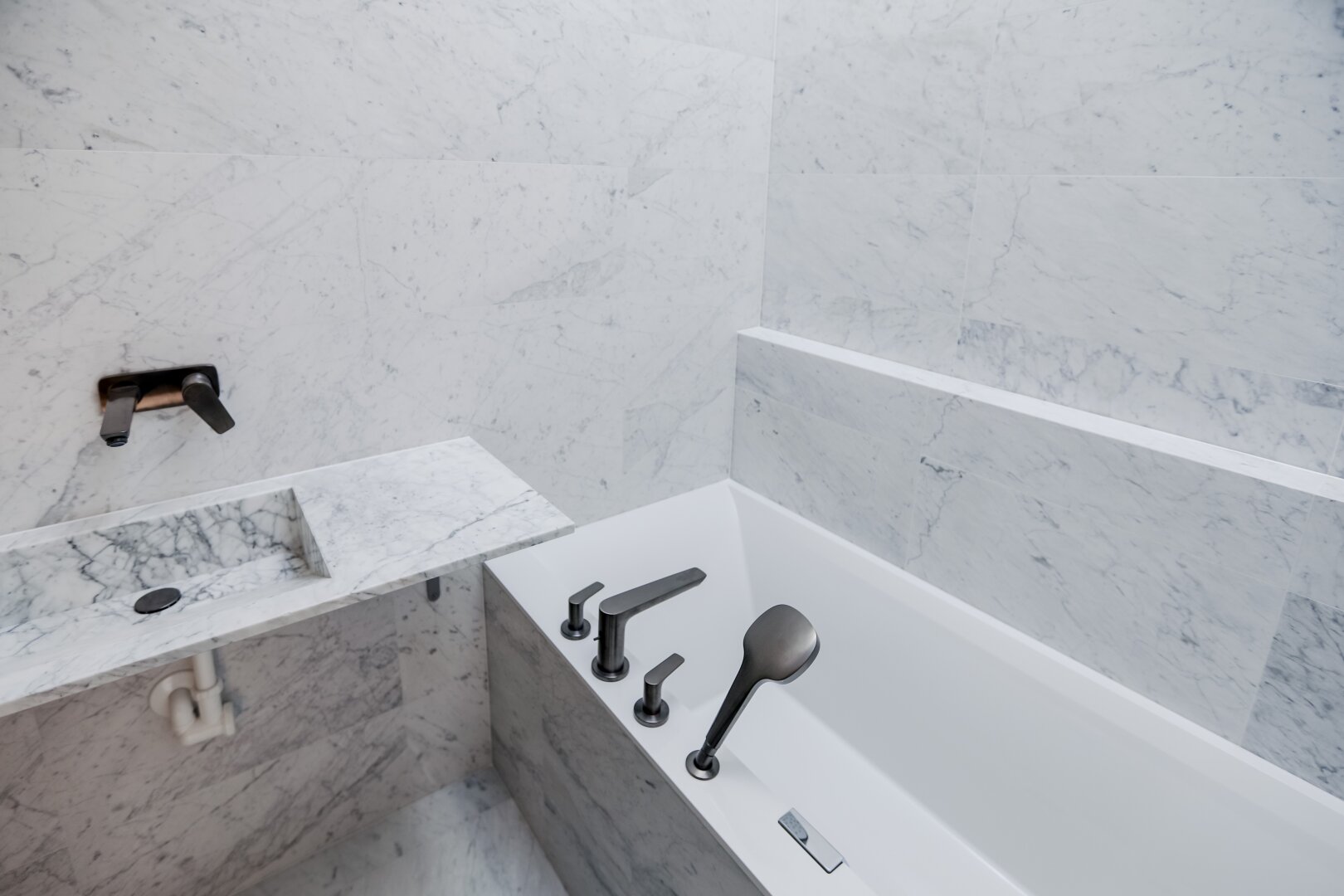 - Materialität in Perfektion: Edler Carrara-Marmor in den Bädern, feinstes Echtholzparkett und Design-Armaturen setzen luxuriöse Akzente.